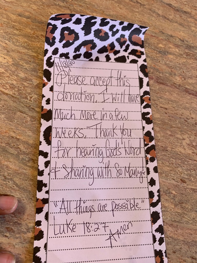 I praise God for using me, but most of all, I praise God for the people that he uses in my life. I am so grateful for those who pray for me, those who encourage me in words and actions. Sharing life with you means more than you know. Please know that you gave me the Hope I needed to press on. To the person who left this note at the store, thank you! Continue to be a vessel for the Lord.